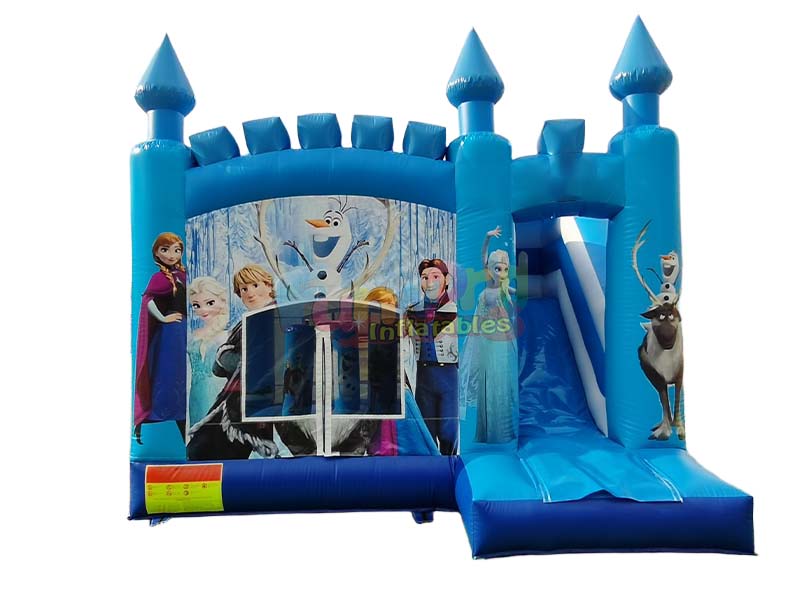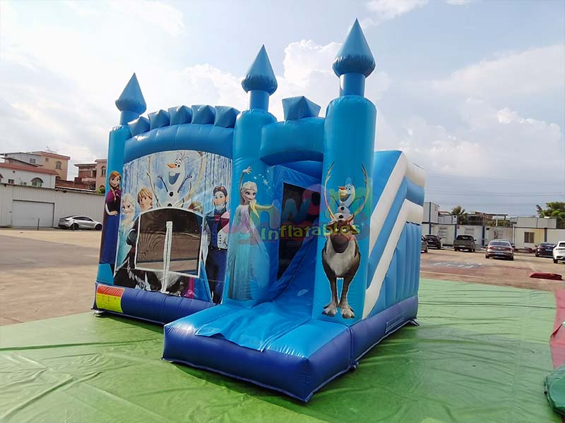 Este castillo inflable con juegos interactivos Evoca un sueño de cuento de hadas de hielo y nieve. En su interior, diversos personajes animados cobran vida, cada uno vibrante y encantador. Las imponentes agujas del castillo crean una experiencia visual impactante, haciendo realidad los sueños de los niños. Un elegante y vibrante tobogán inflable azul a la derecha añade aún más diversión y aventura a la experiencia de juego infantil, creando un espacio de juego cautivador.
