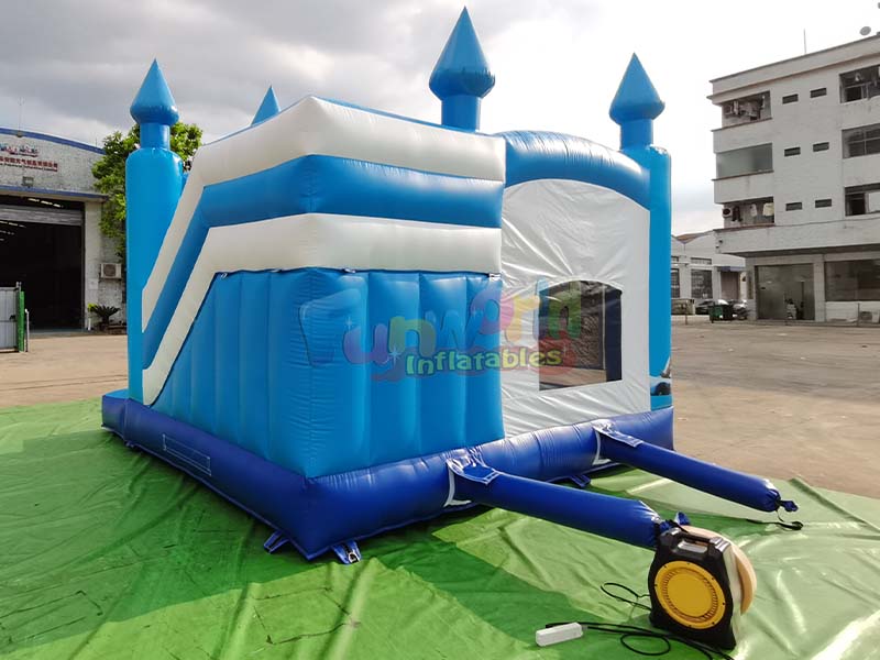 Este castillo inflable al por mayor presenta exquisitos detalles de diseño. Fabricado en PVC azul y blanco vibrante, es estable y flexible, garantizando la seguridad de los niños. Dos entradas de aire azules en la base garantizan un inflado eficiente y mejoran la estabilidad estructural. Además, las ventanas de malla garantizan una excelente circulación del aire, mientras que las torres realzan su estética de cuento de hadas, garantizando la seguridad y comodidad de los niños durante esta experiencia de juego inmersiva.