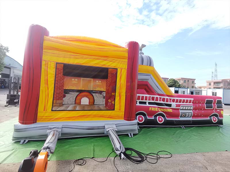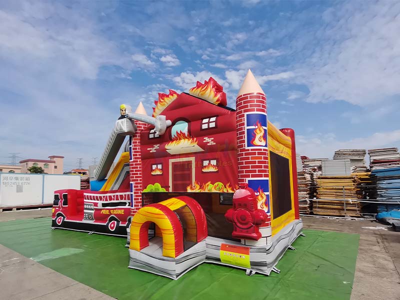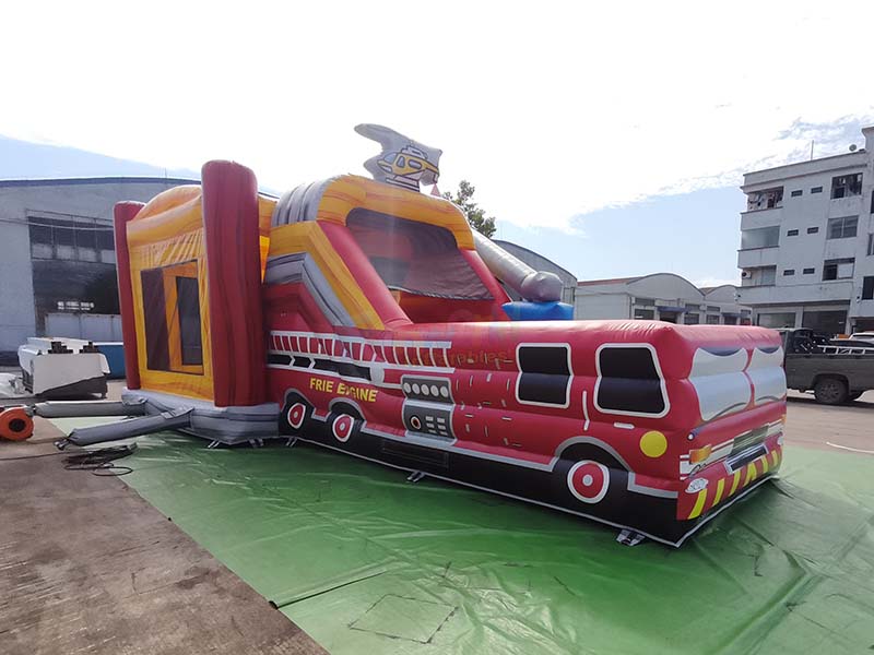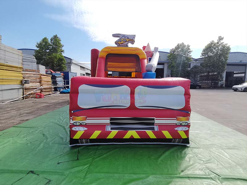 Fire truck bounce house. The striking red and yellow color scheme is instantly eye-catching, and it integrates a trampoline and a slide for double the fun and immersive interactive play for children.