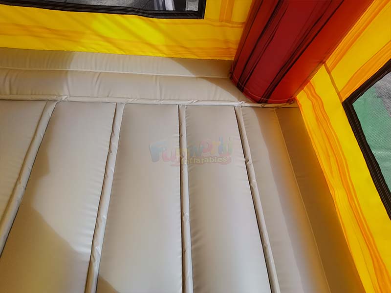 Inflatable moonwalk bounce house. The area features multiple parallel yellow reinforcement strips, which are tightly bonded to the main fabric using a heat-sealing process. This strengthens the structural stability of the area, reduces fabric stretching caused by bouncing impacts, and improves durability.