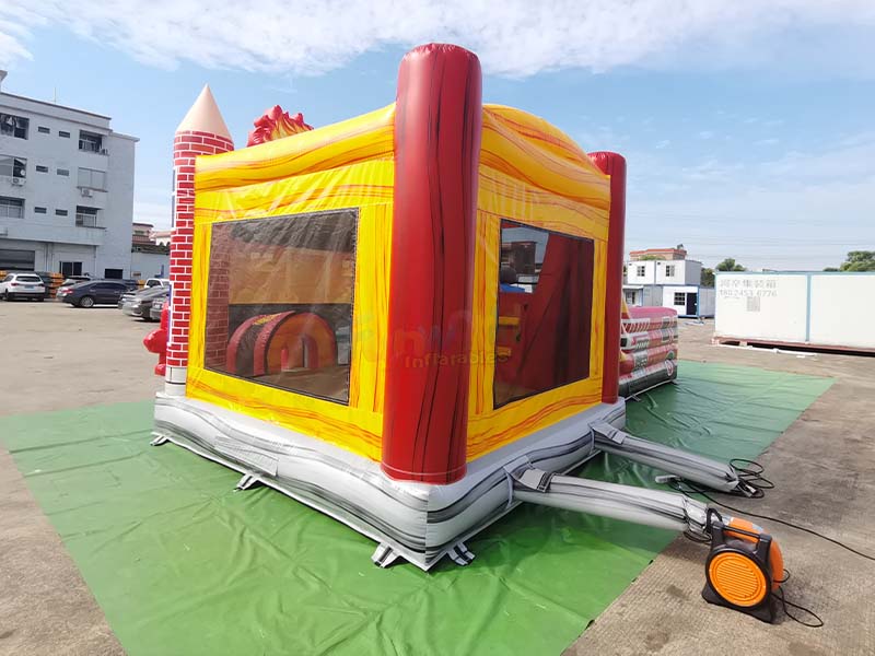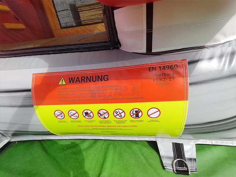Large outdoor bounce house. Each decorative panel is connected to the red panel using a set of black snap-on fasteners at the top and bottom. The fastening points of the snap-on fasteners are tightly fitted, without any looseness or misalignment, ensuring the stability of the decorative structure and giving the thematic elements a more three-dimensional appearance.