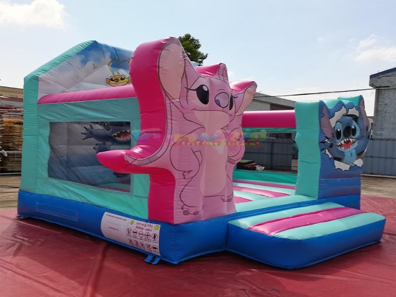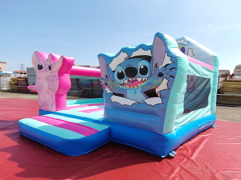 Puntada casa inflable inflable Representa el concepto de un peculiar parque de juegos interestelar. Sus vibrantes colores, personajes tridimensionales y su ingenioso diseño estructural crean un parque infantil visualmente impactante. Los escalones de entrada presentan un patrón de rayas azules y rosas que realza la paleta de colores y crea una atmósfera de ritual para los niños que entran. Las ventanas transparentes en las paredes laterales garantizan la transparencia durante el juego y añaden un toque de encanto de castillo al diseño general. Una vez inflado, la forma general es completa y tridimensional, y la impresión vibrante y detallada de la superficie garantiza la integración perfecta de Stitch y Angie. Cada línea y color evoca con precisión el estilo de animación, encapsulando el alegre universo de Lilo Stitch en este castillo inflable.