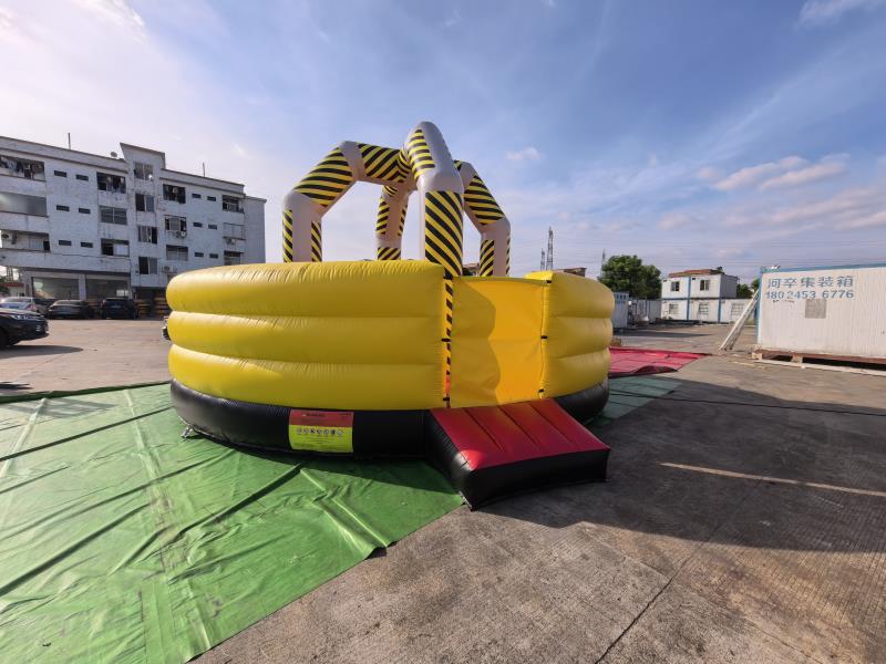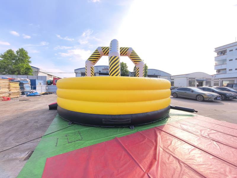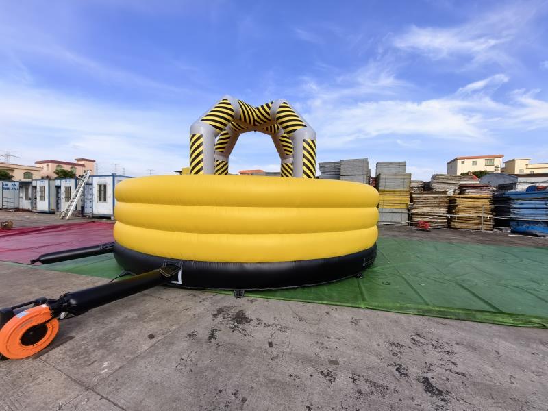 Bola de demolición de castillo inflable Presenta un borde circular inflable de varias capas, principalmente de un amarillo brillante y vibrante, que crea una apariencia visualmente impactante y vibrante. La parte inferior del borde está reforzada con un borde inflable negro más grueso, que realza el contraste de color y aporta estabilidad a la base.