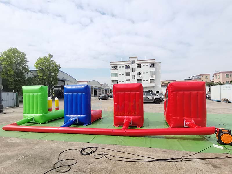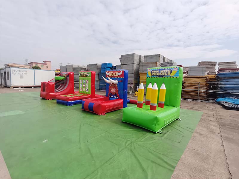 Los juegos inflables 4 en 1 están fabricados con paneles inflables con rayas verticales rojas y blancas, lo que crea una superficie lisa y uniforme. Una red de malla transparente está instalada en el interior del marco, lo que proporciona visibilidad y protección sin obstáculos.