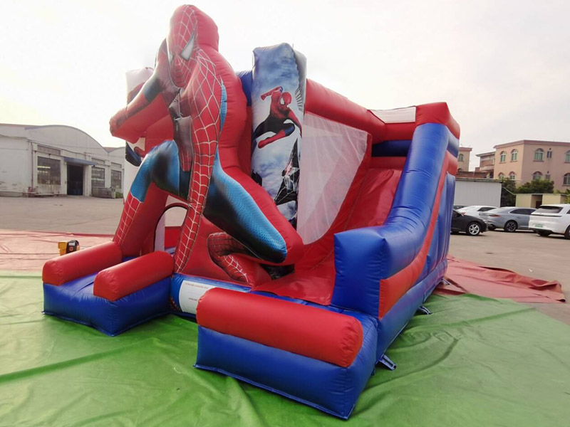 El castillo inflable Spiderman cuenta con una base plana y suave, y ventanas de malla transparente a ambos lados garantizan la ventilación interna y facilitan la observación externa de la dinámica, mejorando así la seguridad durante su uso. Las costuras están reforzadas con doble línea para resistir eficazmente la fricción y los tirones durante el uso frecuente.