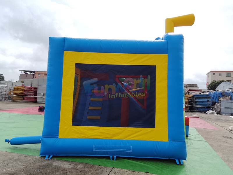 El castillo inflable para saltar presenta detalles ingeniosos. Fabricado principalmente con un material inflable de color azul intenso y brillante, es suave al tacto y ofrece una excelente amortiguación, garantizando la seguridad de los niños. Las dos columnas inflables rojas en la imagen son elegantes y voluminosas, añadiendo un color vibrante al área, a la vez que refuerzan la estructura y reducen el impacto en caso de colisión. La escalera de escalada expuesta a la izquierda presenta una alfombra amarilla en contraste y tiras de agarre negras, lo que facilita que los niños se agarren y suban, haciendo que la escalada sea divertida y segura. Las paredes inflables azules circundantes son lisas y están completamente infladas, creando un espacio seguro y cerrado. También hay una abertura de luz arqueada a la derecha que deja entrar la luz para iluminar el espacio, creando un pequeño escenario para que los niños observen e interactúen, lo que aumenta la diversión del juego.