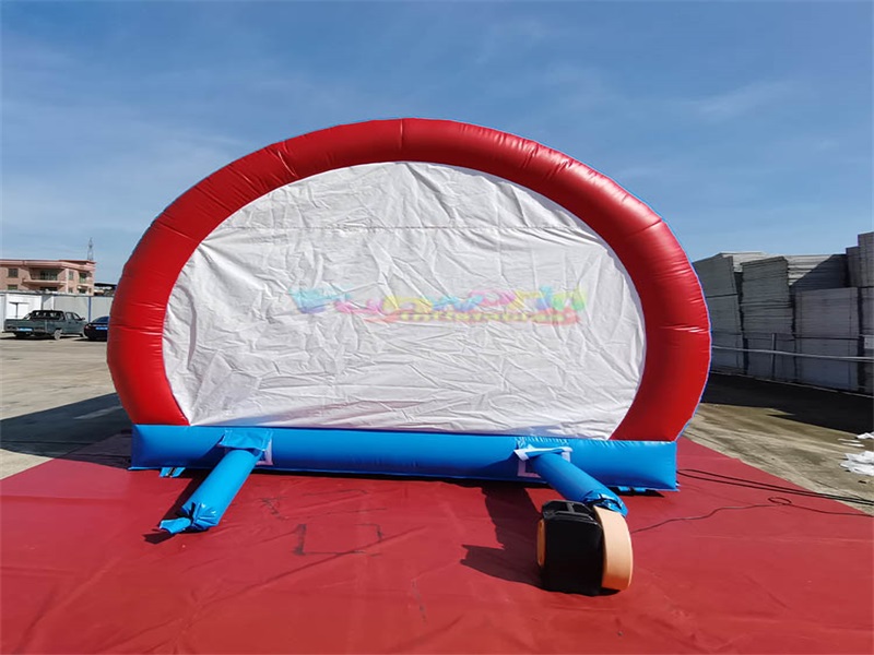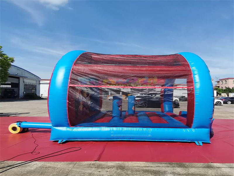 Castillo inflable portátil para fiestas. Las franjas inflables en la zona de salto son lisas y brillantes, y las uniones son firmes y lisas, sin imperfecciones visibles, lo que garantiza un rebote cómodo y una fabricación meticulosa. Los bordes de los componentes inflables se conectan de forma natural, las cámaras de aire son completas y nítidas, y las estructuras inflables rojas y azules se conectan con suavidad y son herméticas. Cada zona inflada tiene una forma sólida y regular, lo que demuestra la rigurosa fabricación.