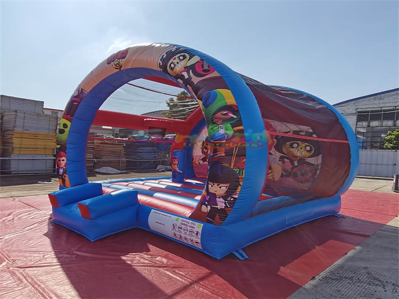 Castillo inflable Es visualmente atractivo y presenta un castillo inflable con temática de dibujos animados. La estructura principal es un inflable azul intenso que crea un arco semicerrado. El arco y los laterales están cubiertos con vibrantes y vívidas imágenes de dibujos animados, con una variedad de personajes divertidos y una rica paleta de colores. Los bordes están acentuados con componentes inflables en azul y rojo que contrastan, creando un diseño elegante y en capas. Los laterales cuentan con un diseño protector transparente y texturizado para garantizar la seguridad del producto.