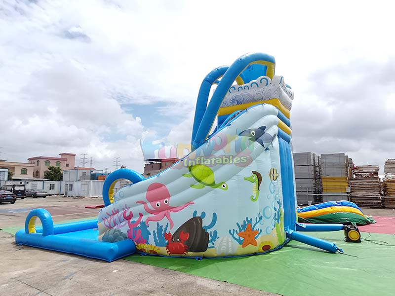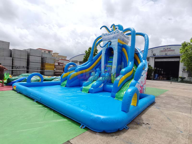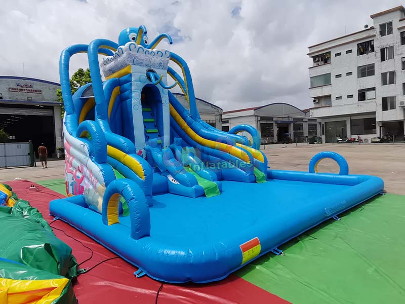El tobogán acuático inflable Octopus está fabricado con un material grueso, elástico y resistente al desgaste, lo que proporciona una experiencia segura y cómoda. Una zona central de escalada con escalones verdes facilita el acceso a la cima. La superficie lisa a ambos lados, creada por la estructura inflable, permite un deslizamiento suave y atractivo. Su diseño elegante y su estructura estable una vez inflado lo hacen ideal para diversas actividades de ocio al aire libre, brindando alegría a personas de todas las edades.