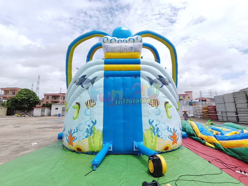 El tobogán inflable tiene una superficie lisa y recta, y la pendiente se ha calculado con precisión, lo que no solo garantiza el placer suave del deslizamiento, sino que también puede controlar suavemente la velocidad para evitar riesgos de seguridad causados por deslizarse demasiado rápido; los bordes del tobogán son redondeados sin bordes afilados, eliminando por completo el riesgo de rayones.
