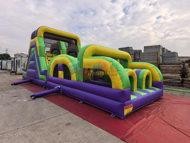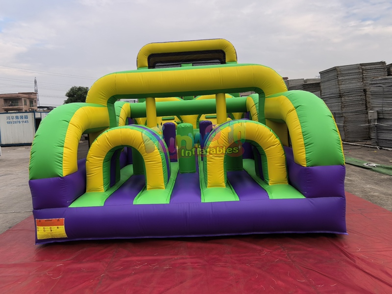 Este42 pies de largo Casa inflable con pista de obstáculos para adultosEstá lleno de obstáculos inflables que harán que tus invitados se diviertan al máximo durante toda la fiesta o evento. Al principio de esta carrera de obstáculos, te encontrarás corriendo por una gran variedad de obstáculos. Los participantes deberán superar una divertida pared de escalada para llegar a la cima antes de experimentar la emocionante carrera hacia abajo en los toboganes dobles, comenzando con este tobogán doble de 7 metros para terminar la carrera en la parte inferior del tobogán. Dominado por una impactante paleta de colores de morado oscuro, verde lima y amarillo brillante, el circuito promete un desafío visualmente emocionante para participantes de todas las edades.