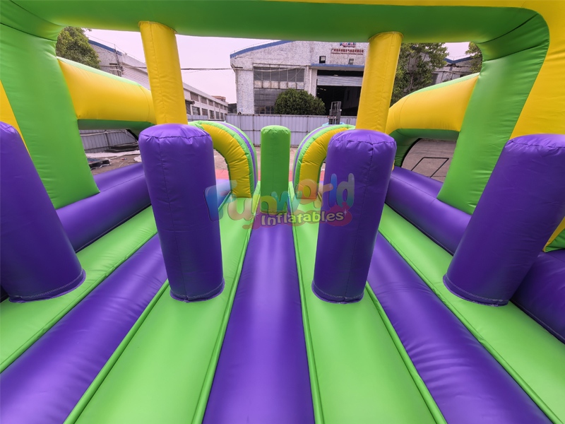 Casa inflable de obstáculos para exteriores para adultos, ideal para patio trasero. Es una atracción dinámica y atractiva, diseñada para eventos, fiestas y actividades de team building. Con una impactante paleta de colores que combina morado oscuro, verde lima y amarillo brillante, esta unidad promete un desafío visualmente emocionante para participantes de todas las edades.