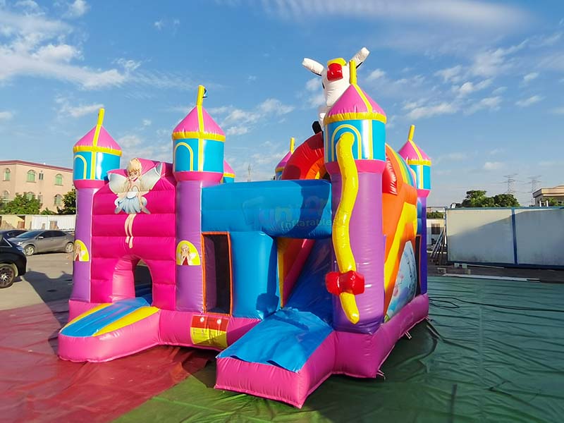 Casa inflable combinada de unicornio Presenta un hada alada, con detalles nítidos en su vestido y alas. Iconos de hadas a juego en ambos lados realzan la atmósfera de cuento de hadas.Un tobogán azul brillante está unido al lado derecho del castillo, con un arco rojo decorativo sobre él. Un unicornio blanco con cuernos rojos se sienta sobre el arco, con una expresión tierna y adorable.El castillo cuenta con un pasaje de entrada en la parte inferior, con escalones en rosa, azul y amarillo. El diseño general es redondeado y amplio, y emana un encanto lúdico e infantil.