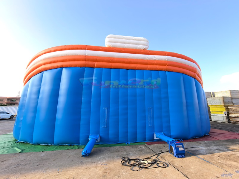 Tobogán de agua inflable para piscinaEl cuerpo principal del tobogán presenta un diseño tridimensional multicapa, con múltiples toboganes de diferentes colores. Los toboganes espirales naranjas y blancos, y los toboganes rectos azules y blancos, están dispuestos de forma escalonada. El exterior está decorado con formas tridimensionales naranjas, ricas en capas y llenas de diversión infantil. Cada tobogán termina con un cojín de seguridad rojo, lo que garantiza la seguridad y realza el atractivo visual.La piscina infantil es una estructura inflable circular con un borde inflable naranja completo y redondeado y una base impermeable azul plana. Se conecta a la perfección con el módulo del tobogán, creando un diseño general suave y armonioso. Esta atractiva estructura resulta muy atractiva en exteriores y llama la atención rápidamente.