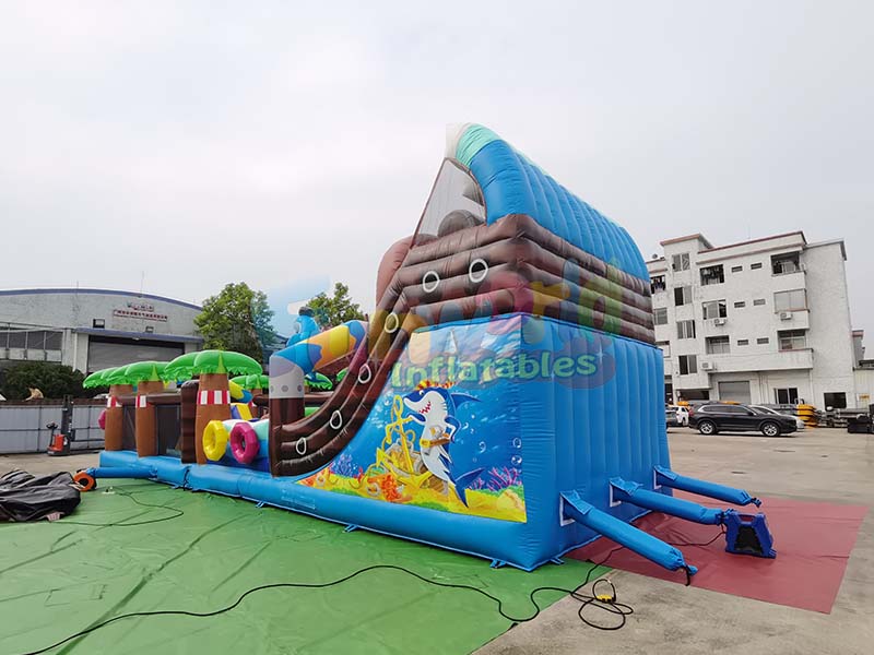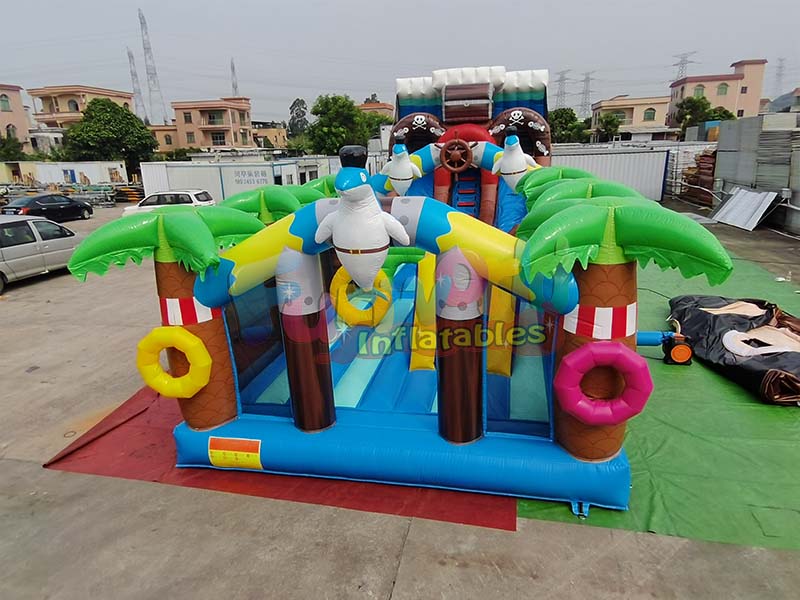 El tobogán hinchable con temática pirata integra un tobogán, una pista de obstáculos interactiva y divertidos módulos multifuncionales.