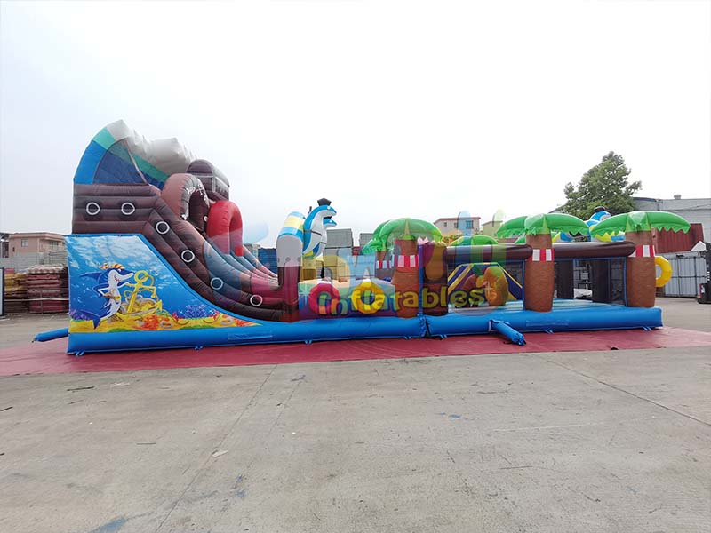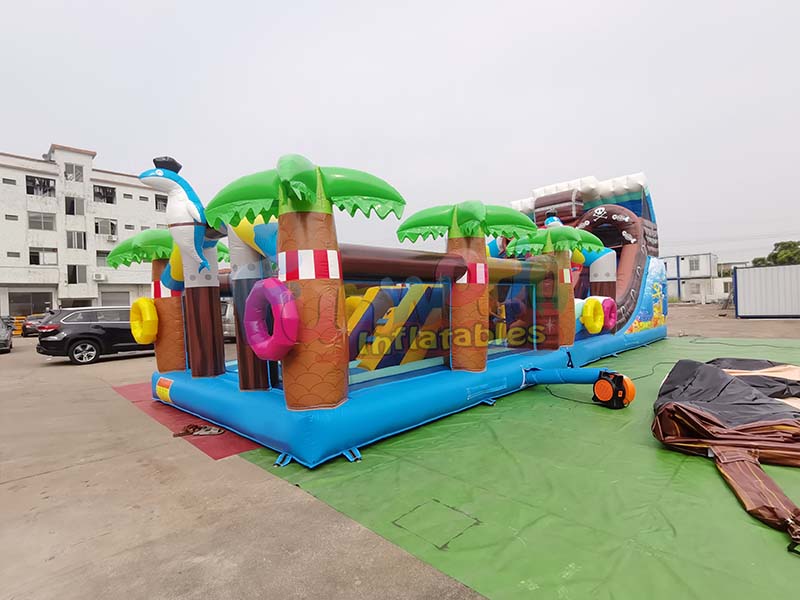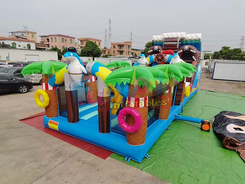 temática pirata gran tobogán inflableCon su exterior azul, esta cama elástica combina elementos de isla tropical y aventura pirata, creando una experiencia visualmente atractiva y llena de fantasía. Varias palmeras de aspecto realista adornan la estructura, con troncos marrones texturizados y copas de un verde vibrante. Un delfín azul y blanco con sombrero de pirata realza el encanto de la temática pirata. La cama elástica cuenta con coloridos aros interactivos y una zona de tobogán decorada con una calavera pirata, además de elementos de diseño que recuerdan a un barco pirata. La estructura completa incluye una zona de salto, una pista de obstáculos y módulos de tobogán, con diversos colores y formas dinámicas, creando un entorno de juego inmersivo de aventura en una isla pirata y ofreciendo a los niños un espacio interactivo repleto de imaginación y alegría.