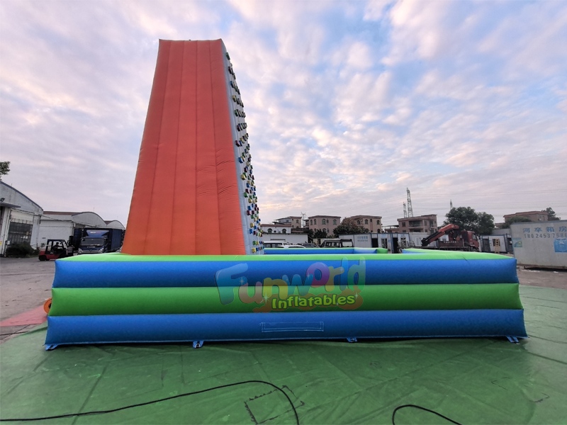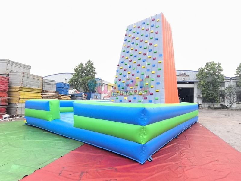 EsteMuro de escalada inflable para escaladores de roca, iEstá construido con lona de PVC resistente de calidad comercial y generalmente consta de una torre de escalada alta y vertical con varias filas de asideros duraderos, rodeada por una base inflable grande y acolchada para mayor seguridad. Estas unidades versátiles son ideales para ferias escolares, actividades de team building corporativas y fiestas de cumpleaños, y ofrecen un efecto sorprendente que atrae a multitudes. Su instalación es eficiente, ya que requiere un potente ventilador (a menudo incluido) y ocupa poco espacio, lo que permite su instalación tanto en interiores como en exteriores. Están diseñadas para soportar un peso considerable, a menudo con participantes de hasta 90-113 kg.