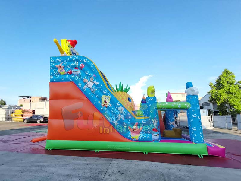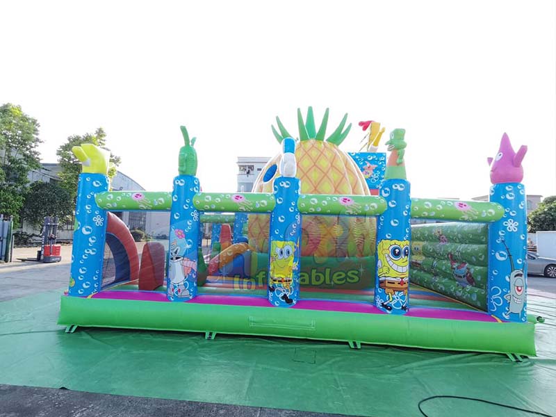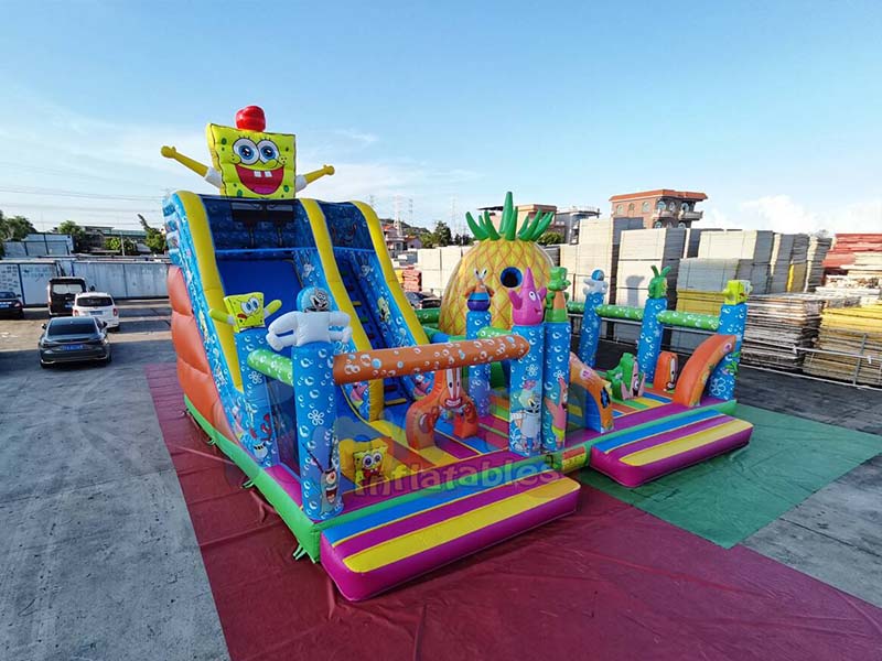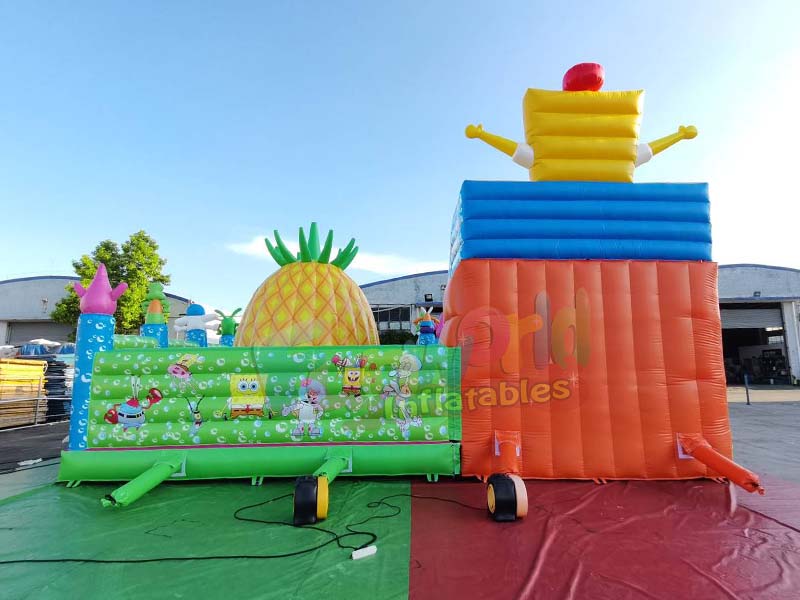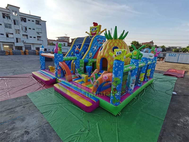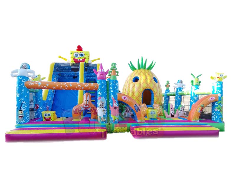 tema de Bob Esponja casa hinchable para exteriores El diseño es una fusión perfecta de diversión y arte visual. Se centra en la clásica franquicia de Bob Esponja, con una paleta de colores inspirada en el mundo marino.La impactante forma tridimensional de la icónica casa de piña, junto con los personajes de Bob Esponja, la parte superior del tobogán y elementos de personajes como Patricio Estrella y Calamardo, se encuentran estratégicamente ubicados por todo el complejo, evocando plenamente los recuerdos infantiles de la propiedad intelectual. El complejo cuenta con un tobogán azul de dibujos animados con gráficos de Bob Esponja impresos en las pistas, creando la sensación de un viaje a través de un divertido mundo submarino. Múltiples pistas de obstáculos y áreas interactivas se incorporan entre las estructuras inflables, creando un espacio de juego con múltiples capas que reproduce a la perfección la alegre atmósfera de Fondo de Bikini. Cada detalle del exterior transmite una sensación inmersiva de diversión y emoción infantil.