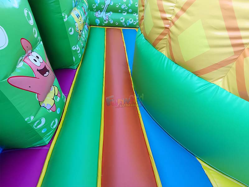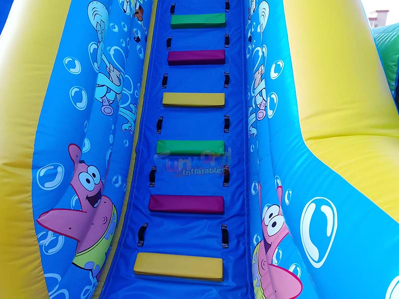 El castillo inflable gigante de Bob Esponja para patio trasero presenta una estructura detallada. Los escalones inflables naranjas de la entrada a la casa de piña están impresos con puntos blancos, simulando una textura de esponja suave al tacto y fácilmente reconocible. Los módulos inflables presentan costuras meticulosamente elaboradas y los colores impresos son altamente saturados, con patrones tridimensionales nítidos. Incluso de cerca, los exquisitos colores y formas son evidentes.