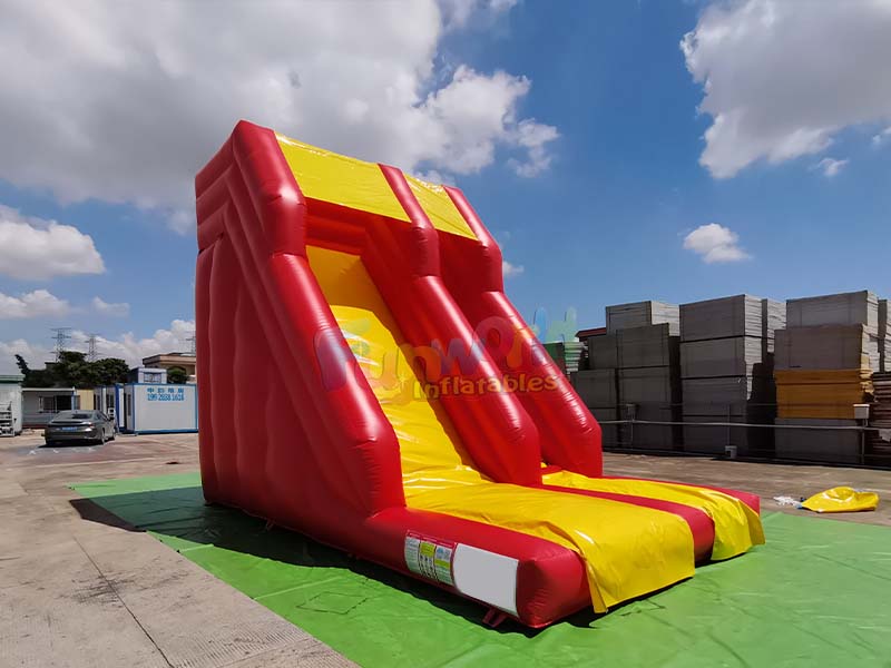 Tobogán inflable para exteriores Los vibrantes colores captan la atención al instante. La amplia estructura tridimensional cuenta con una rampa amarilla empinada pero suave, flanqueada por protectores laterales inflables de un rojo vibrante que garantizan la seguridad y realzan la vibrante paleta de colores. La plataforma superior y la zona de amortiguación inferior son amarillas, mientras que el rojo envuelve la estructura principal, dándole una llamativa silueta tridimensional. Una vez inflado, el tobogán adquiere una forma completa y dinámica. Sus vibrantes colores y su forma tridimensional captan fácilmente la atención del niño y lo convierten en el centro de atención.